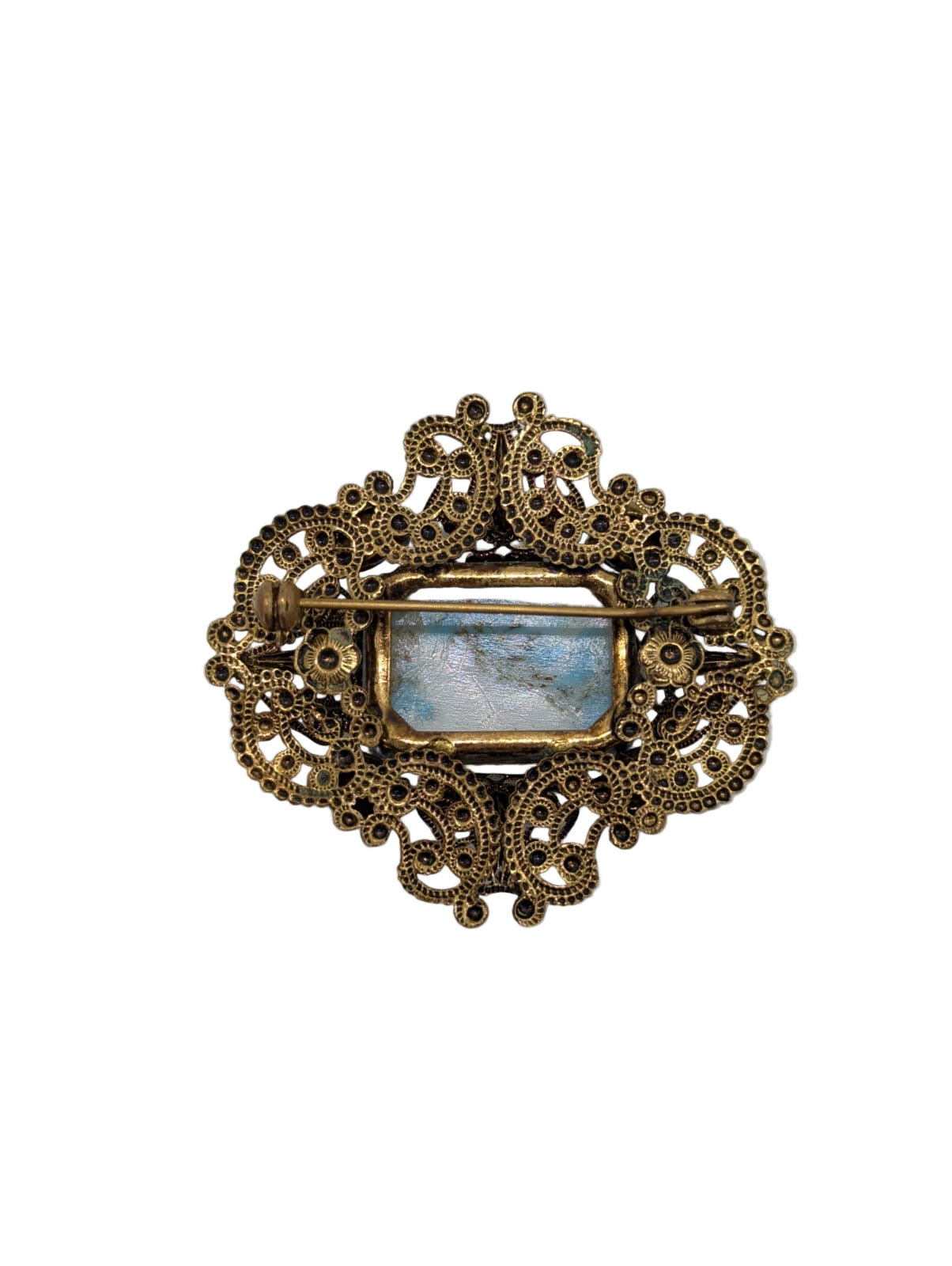 A striking example of early 20th-century Czech craftsmanship, this 1930s Vintage Czech Filigree Brooch features an ornate brass setting embellished with exquisite Peking glass—a signature stone of the era known for its marbled, gemstone-like finish.