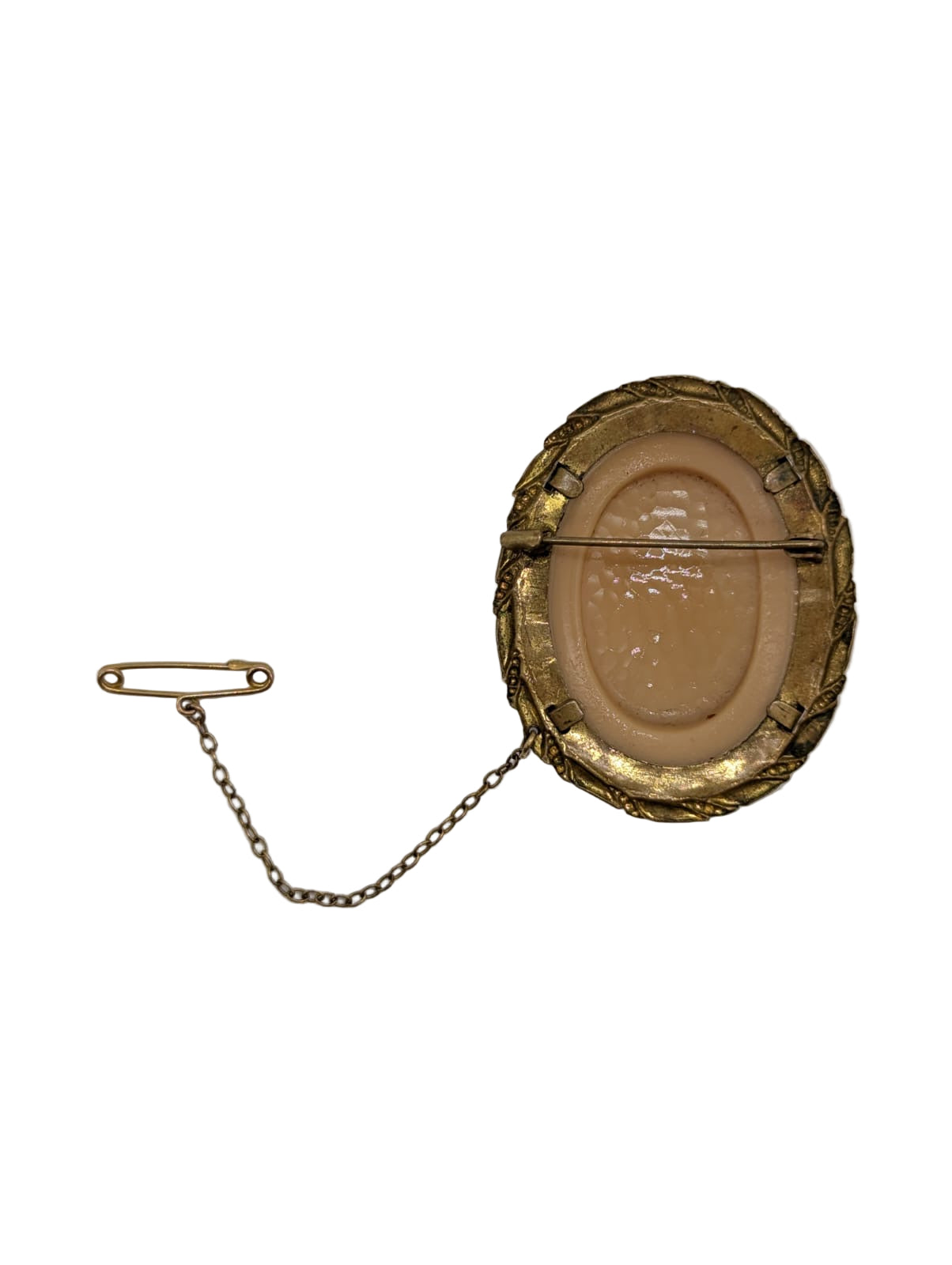 A beautifully preserved vintage cameo brooch, featuring a classic carved-effect portrait framed in an ornate oval setting. This piece includes its original safety chain and pin, a charming detail, adding both security and an extra layer of antique character.