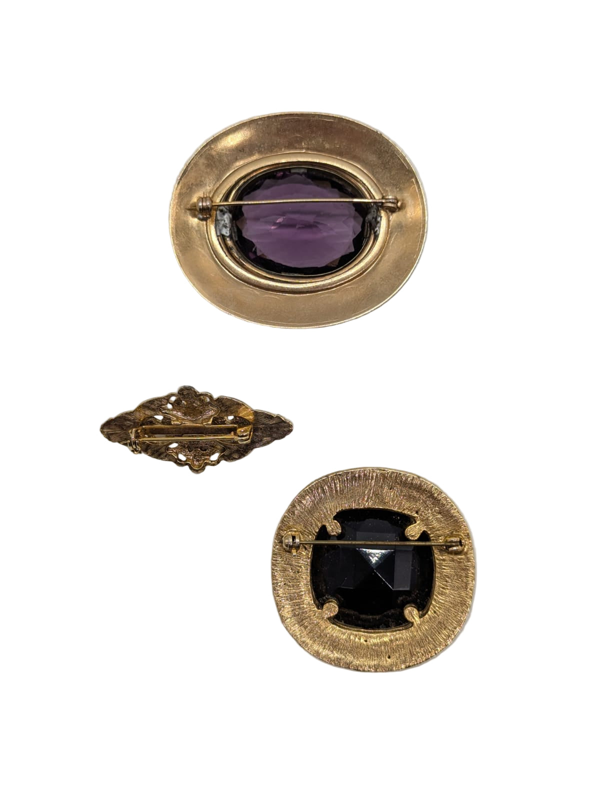 A beautifully curated trio of vintage brooches, the Il Trio Barocco Vintage Brooch Set brings together old-world charm, bold stones, and ornate metalwork. Featuring rich amethyst and onyx tones framed in intricate gold settings, this set is perfect for collectors, stylists, or anyone who loves adding a touch of dramatic vintage elegance to their wardrobe.