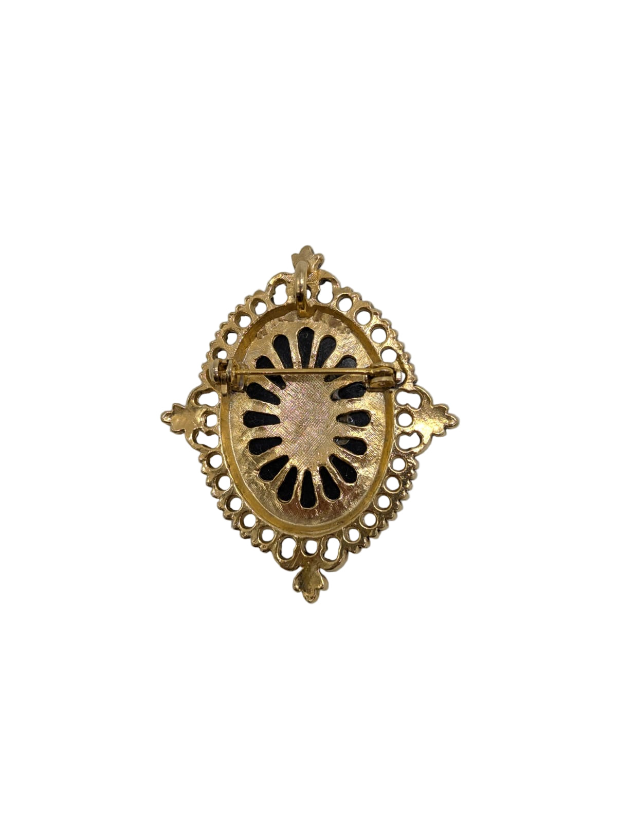 A timeless beauty with classic Italian charm, this Vintage Lady of Verona Cameo Brooch Pin brings an elegant touch to jackets, dresses, scarves, and knits. Set in an ornate open-work gold-tone frame, the finely carved cameo features a softly profiled lady in cream and black—an effortless statement for cameo collectors and lovers of vintage adornment.