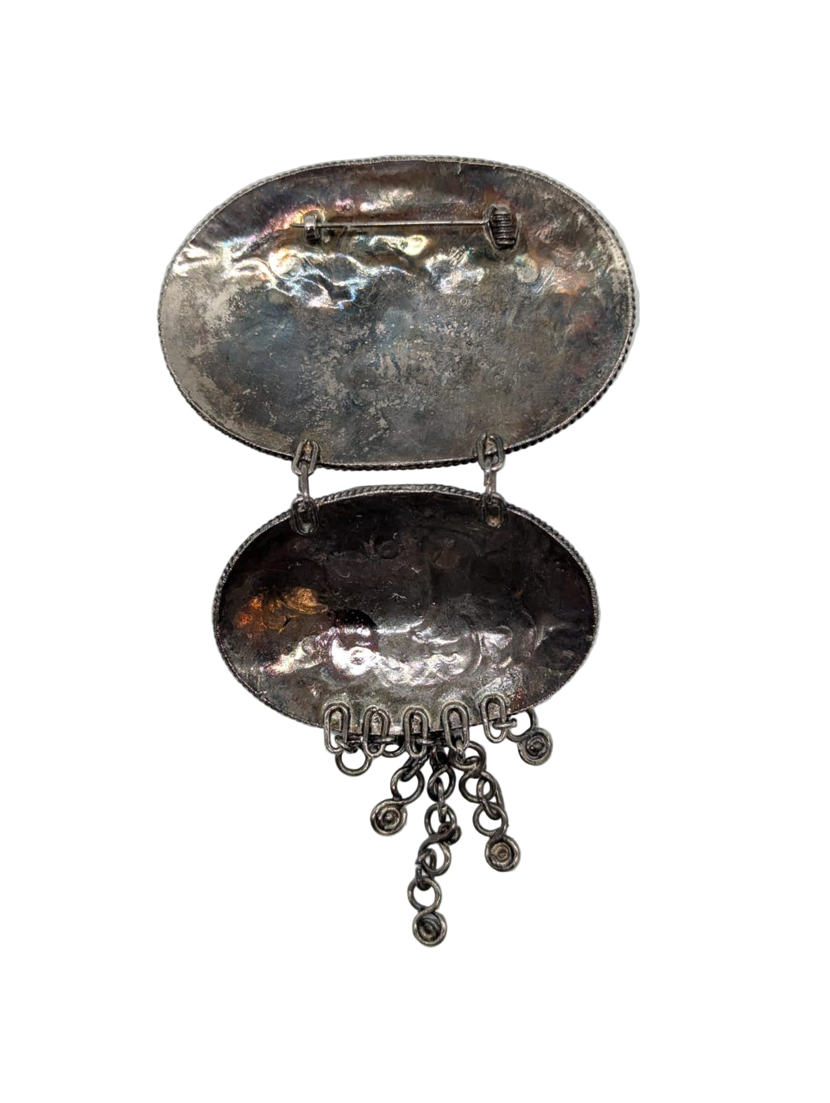 A dramatic statement piece with undeniable old-world charm, this Medaglione Cascata Vintage Brooch Pin (14 cm x 8 cm) showcases an ornate double-medallion design with exquisite stamped detailing and cascading chains. Its oxidised silver-tone finish gives the impression of antique artisan metalwork, reminiscent of traditional Sicilian and Mediterranean jewellery.