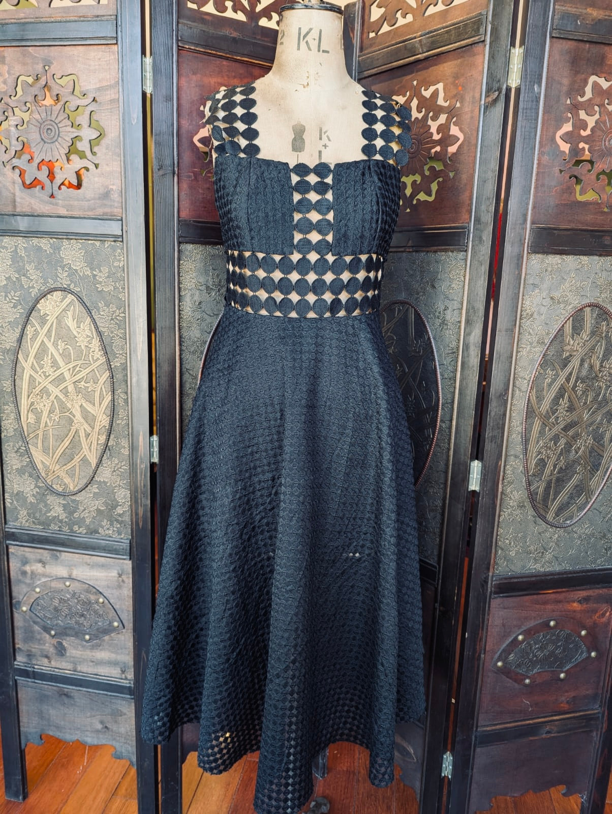 This Shakuhachi black midi dress is a striking piece that embodies modern edge with timeless elegance. Crafted from premium textured polyester, the dress features a geometric cut-out bodice with circular lattice panels across the neckline, waist, and shoulders, creating a bold statement while maintaining balance with its classic silhouette.