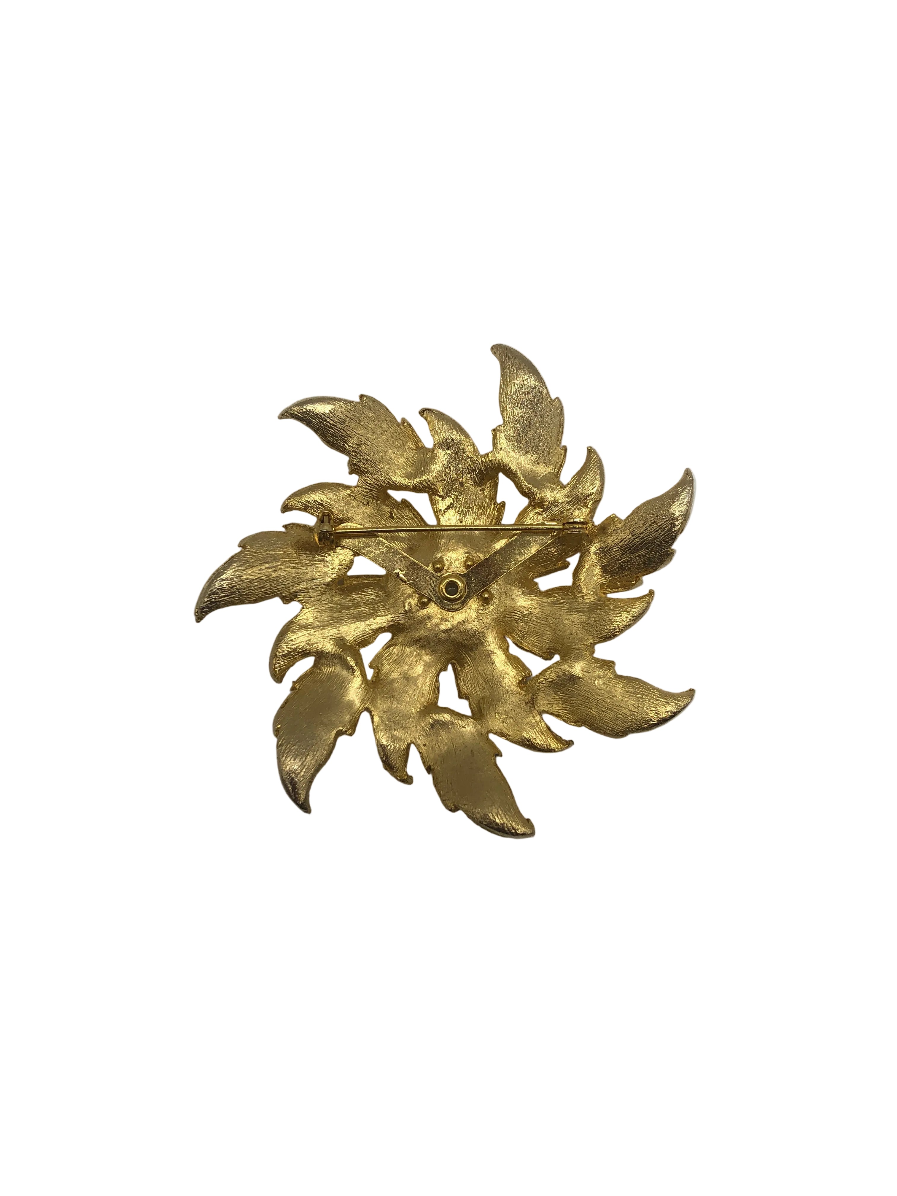 Bold, radiant and beautifully sculptural, the Sole d’Oro Vintage Brooch is a striking statement piece inspired by the natural movement of leaves. Crafted in a rich gold-tone finish, this brooch features layered textured foliage arranged in a dynamic sunburst formation, creating depth and elegant dimension.